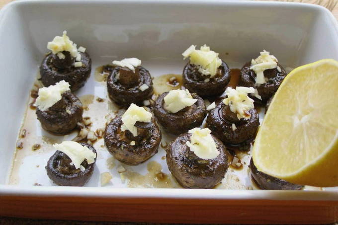 - We halen de vorm met champignons uit de oven, besprenkelen met fijngehakte knoflook, doen een klein stukje boter op elke paddenstoel en besprenkelen met citroensap. Zet het gerecht weer even in de oven. We wachten tot de boter smelt.