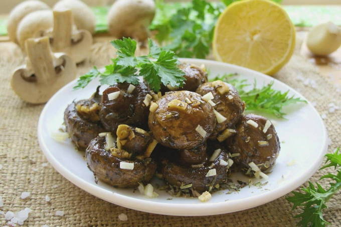 Een van de eenvoudigste en snelste recepten voor het maken van champignons van gemakkelijk verkrijgbare producten. Sappig, met de geur van knoflook en kruiden, kunnen paddenstoelen worden geserveerd als een onafhankelijke snack of als bijgerecht voor vis.