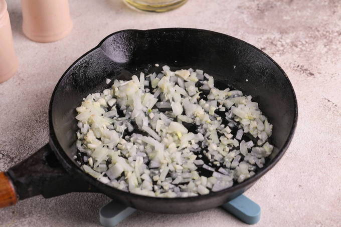 - Het was de beurt aan de vulling voor de vulling. We maken de ui schoon, snijden hem in kleine blokjes en sturen hem om te bakken in een koekenpan die is voorverwarmd met plantaardige olie.