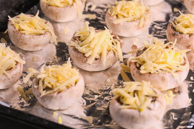 - Rasp de kaas en bestrooi royaal met onze gevulde champignons.
