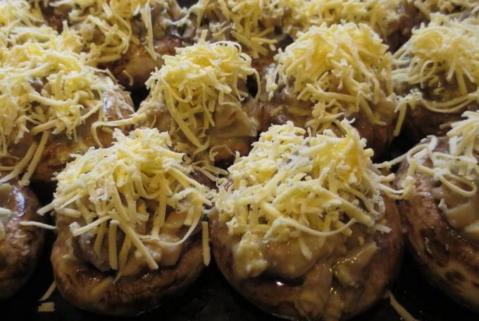- We halen de vorm uit de oven, bestrooien de champignons met geraspte kaas en keren terug naar de oven. Als de kaas gesmolten is, is onze snack klaar. Help jezelf!