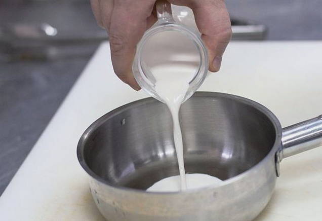 - Laten we beginnen met het maken van de romige saus. Giet de room in een kleine steelpan of kookpan en verwarm deze boven het vuur. Voeg na twee tot drie minuten tijm en fijngehakte knoflook toe aan de room. We blijven nog een paar minuten opwarmen, roeren. Zodra de room begint te koken, haal je de pan van het vuur.