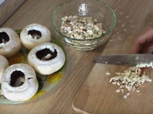 - We kiezen champignons met grote mooie hoeden om te vullen en beginnen met koken. We wassen de champignons onder koud stromend water en drogen. We verwijderen de film van de poten en verwijderen voorzichtig de poten van de doppen. Onze vulmanden zijn klaar.