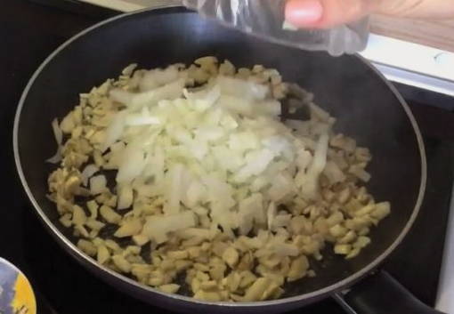 - Giet plantaardige olie in de pan, doe de ui en bak deze op laag vuur tot hij licht goudbruin is. Voeg gehakte champignonpoten toe aan de ui en kook met de ui ongeveer 15 minuten, af en toe roeren.