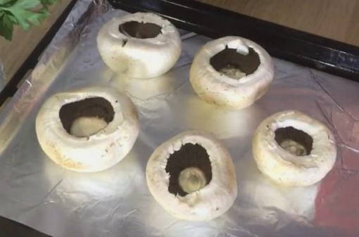 - In een vorm met een kleine hoeveelheid plantaardige olie, leg de champignons met de dop naar beneden en zet ze 25 minuten in een voorverwarmde oven op 180 graden.