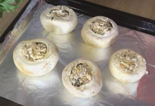 - Vul de champignonhoedjes met de voorbereide vulling. We doen dit zorgvuldig en zorgvuldig, waarbij we proberen de dop niet te breken en er zoveel mogelijk vulling in te doen. We verspreiden de gevulde champignons op een bakplaat, die we afdekken met geoliede folie.