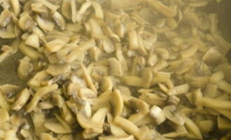 We verwarmen een koekenpan met plantaardige olie en bakken de champignons zodat alle vloeistof verdampt.