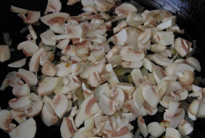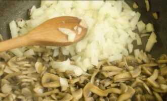 Voeg gehakte uien toe aan de champignons en blijf de uien bakken tot een lichte blos verschijnt.