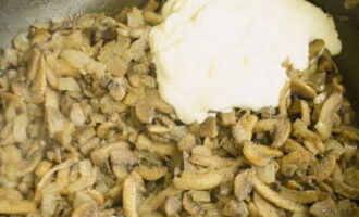 Voeg zure room toe aan de massa, zout en peper. Roer alles goed door elkaar en laat 15-20 minuten sudderen onder een gesloten deksel. Om ervoor te zorgen dat de champignons niet uitdrogen, giet je een beetje water in de pan.