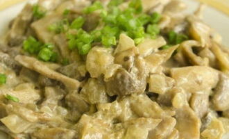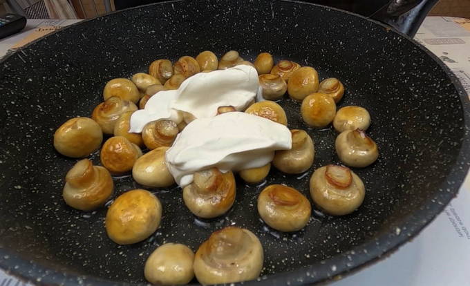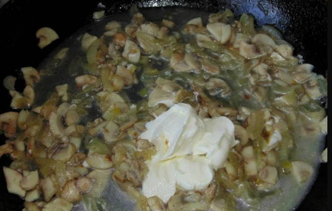 - Hoe champignons gestoofd in zure room in een pan koken?