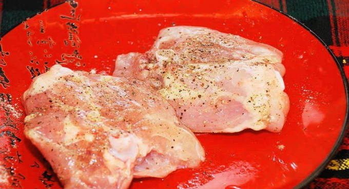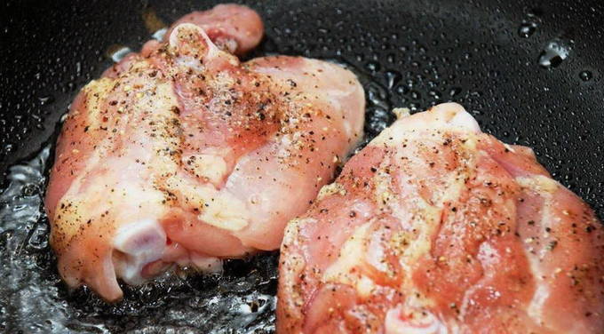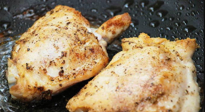 - We verwarmen een koekenpan met plantaardige olie en bakken alle dijen in één keer tot een aangename vergulding. Zorg ervoor dat de kip niet te gaar wordt, anders wordt hij droog.
