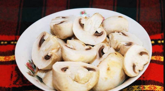 Champignons worden gebruikt als hoofdingrediënt in dit recept. Ze hebben speciale aandacht nodig. Allereerst reinigen we de champignons van de schil en snijden we het been af. Snijd vervolgens de champignons willekeurig in dunne plakjes.