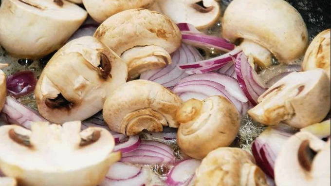 - Snijd de ui in halve ringen, bak 6 minuten onder voortdurend roeren en verdeel de voorgesneden champignons erover. Laat op laag vuur sudderen, kruiden met kruiden.