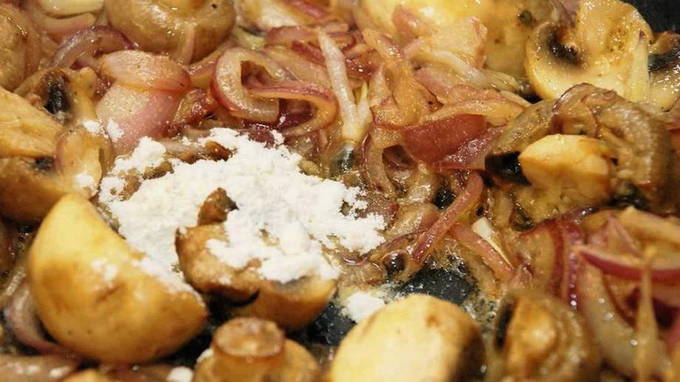 - Voeg wat bloem toe aan de pan met champignons en uien en roer goed. Giet er dan een schep water bij of gebruik liever bouillon. We blijven 15 minuten op laag vuur sudderen tot het ingedikt is.