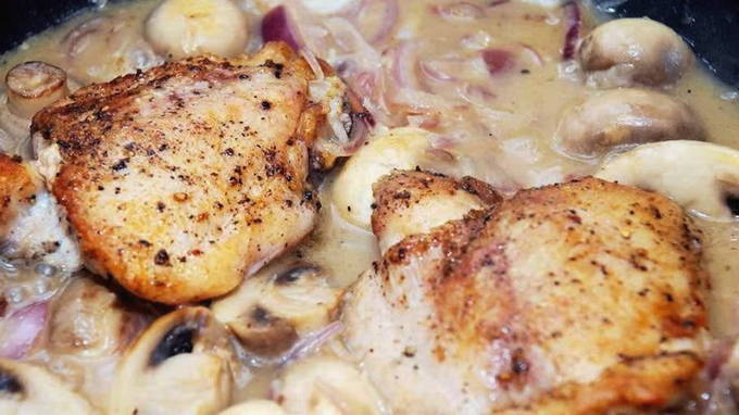 - Combineer de gebakken stukjes vlees met champignons in een koekenpan en giet veel saus over de kippendijen. Voeg eventueel zout toe en breng op smaak met kruiden. Het blijft op laag vuur nog maximaal 10 minuten sudderen met de deksel open zodat de vloeistof kan verdampen.
