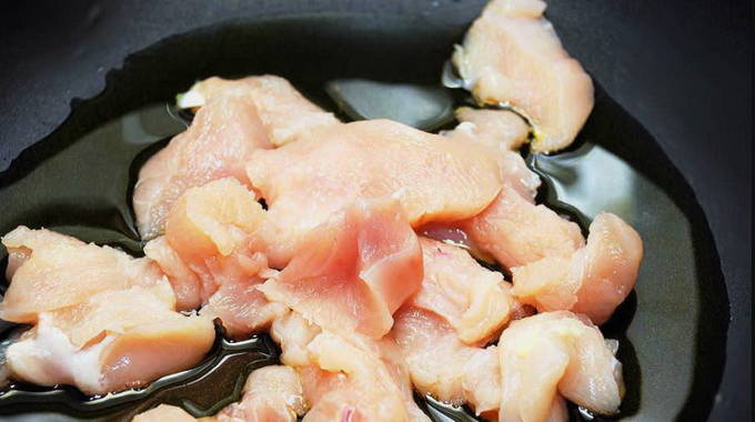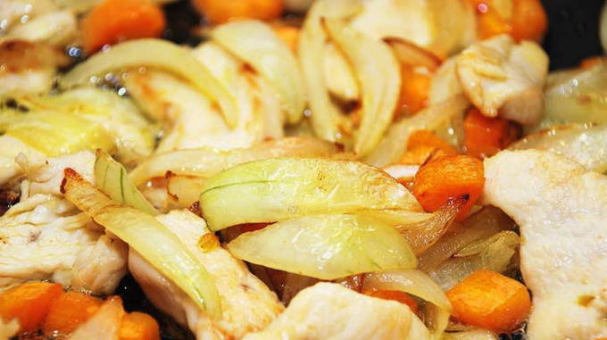- Snijd de kipfilet in kleine blokjes en stuur deze naar een met olijfolie voorverwarmde koekenpan.