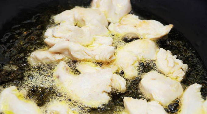 - Wanneer zich een lichte blos op het vlees heeft gevormd, brengt u de stukjes kip over in een andere container.
