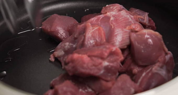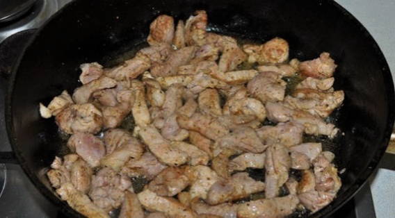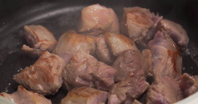 - Verhit een koekenpan met zonnebloemolie en bak stukjes vlees op hoog vuur goudbruin, het belangrijkste is om het vlees niet te drogen en op tijd uit te zetten.