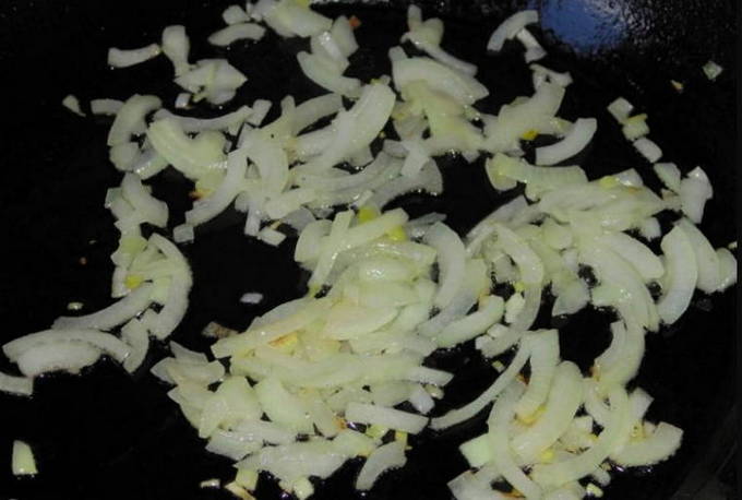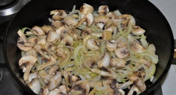 - Snijd de ui in halve ringen en combineer met de champignons. Bak alles in een koekenpan voorverwarmd met boter voor ongeveer 5-8 minuten, af en toe roeren. Het is beter om het vuur niet te verhogen, zodat de paddenstoelen niet verbranden.