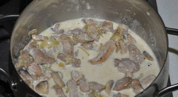 - Malse en zachte kalkoen met champignons in zure room in een pan