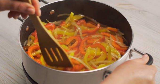 - Terwijl de ui een gouden tint krijgt, hak je de paprika's en wortels fijn en stuur je ze naar de ui. Vergeet niet af en toe te roeren.