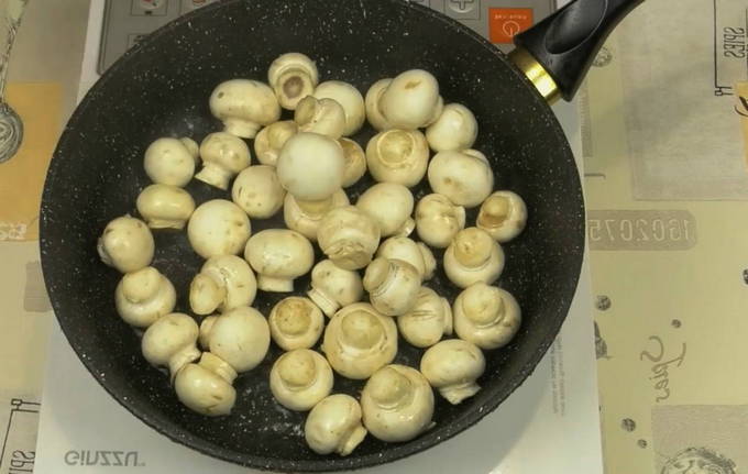 - Om dit gerecht te bereiden, nemen we middelgrote champignons, waardoor we onszelf bevrijden van de noodzaak om ze te malen. Zet op een koekenpan voorverwarmd met plantaardige olie en bak tot een licht goudbruin korstje vormt gedurende 7-10 minuten.
