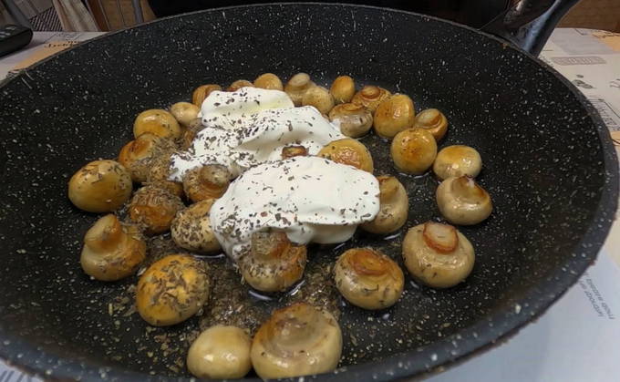 - Bestrooi vervolgens met Provençaalse kruiden, zout en andere specerijen naar keuze. Roer zure room met champignons en laat vijf minuten sudderen.