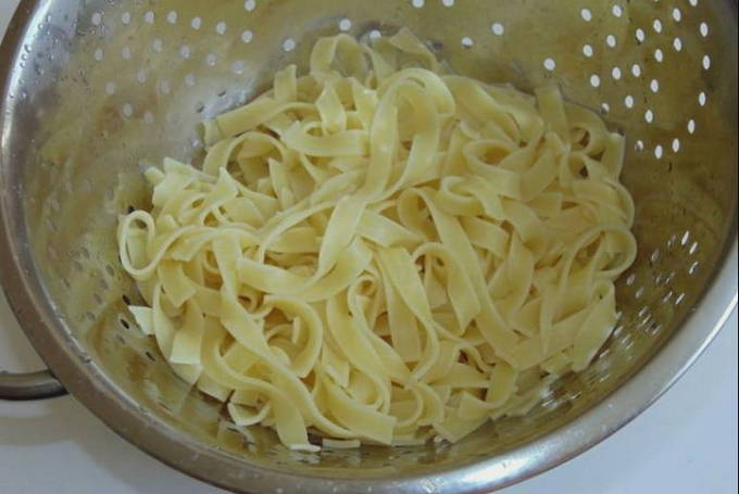 - Terwijl de saus aan het stoven is, gaan we verder met het maken van de pasta. Vul de pan met water en breng aan de kook, voeg na het toevoegen van zout de benodigde hoeveelheid pasta toe en kook tot het gaar is. Daarna gooien we het terug in een vergiet, zodat overtollig water kan weglopen.