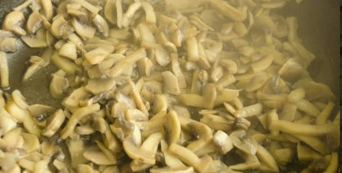 We verwarmen een koekenpan met plantaardige olie en bakken de champignons zodat alle vloeistof verdampt.