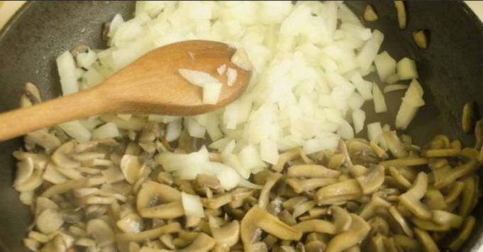 - Snijd de ui in halve ringen en combineer met de champignons. Bak alles in een koekenpan voorverwarmd met boter voor ongeveer 5-8 minuten, af en toe roeren. Het is beter om het vuur niet te verhogen, zodat de paddenstoelen niet verbranden.