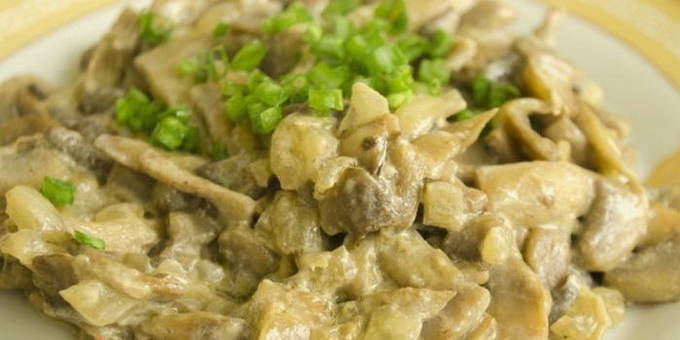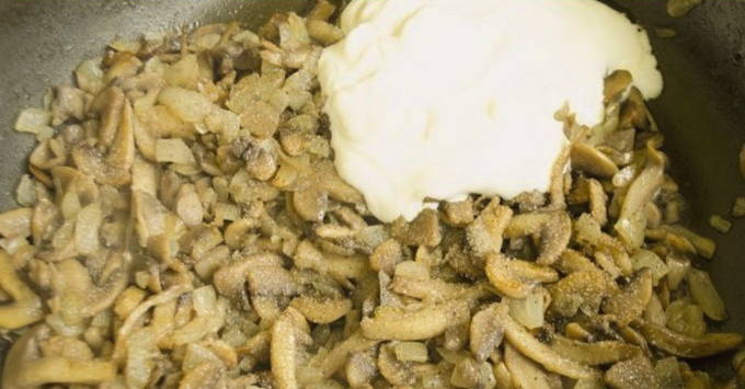 - Hoe champignons gestoofd in zure room in een pan koken?