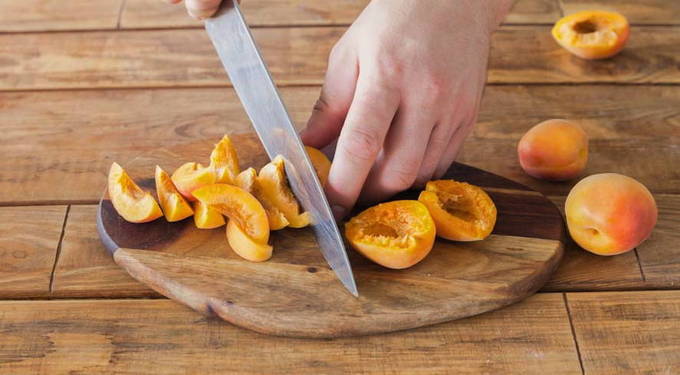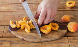 - Verwijder de pit van goed gewassen abrikozen en snijd het fruit in kleine plakjes.