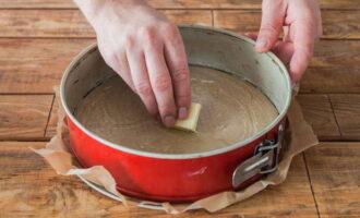 Smeer de charlotte ovenschaal in met licht gesmolten boter. Vervolgens sturen we het voorbereide formulier naar de koelkast.