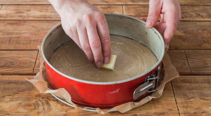 - Verwijder na 13-15 minuten de vorm met de basis voor de cake en verwijder het papier bestrooid met granen.