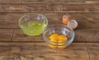 Om het deeg te bereiden, breek je de eieren en scheid je het eiwit van de dooiers, waarna we ze in de koelkast laten wachten op verder gebruik.