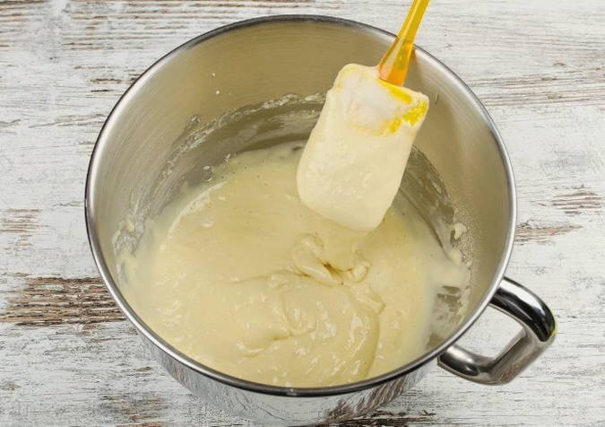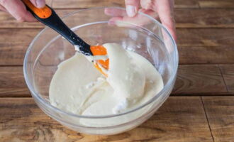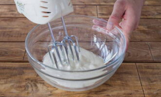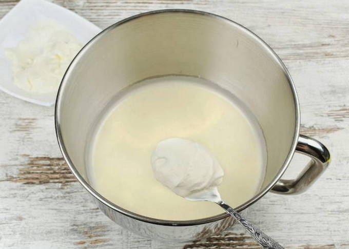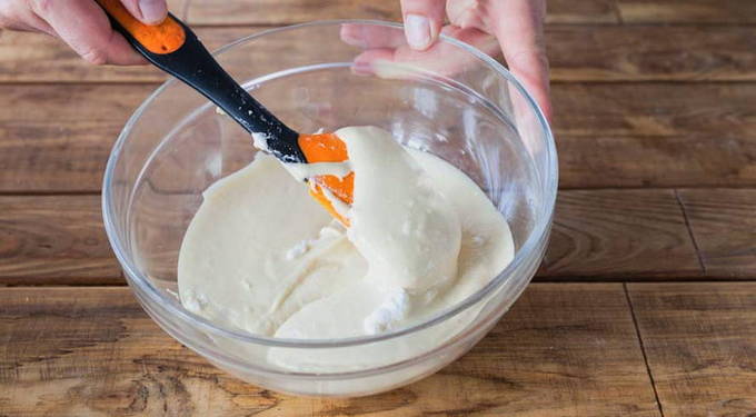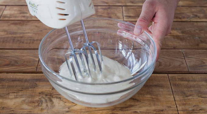 - Meng zure room voorzichtig tot een homogene eimassa en klop zonder een mixer te gebruiken.