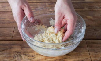 - Combineer eerst alle droge ingrediënten. Giet bakpoeder, kristalsuiker, poedersuiker en gehakte boter bij de gezeefde tarwebloem. We malen alle inhoud tot kruimels.