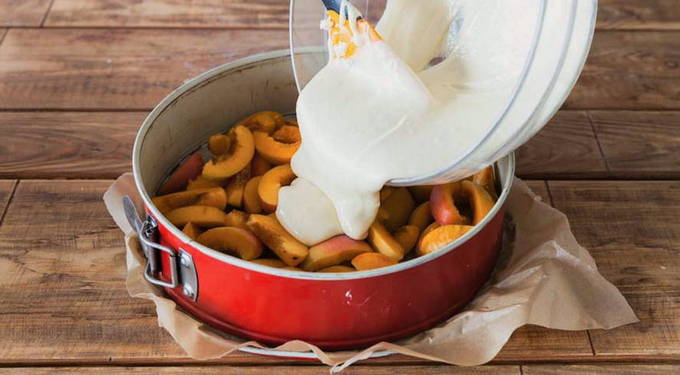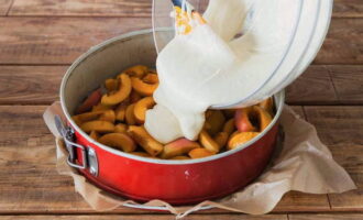 - Bedek de ovenschaal met een vel bakpapier en vul deze met gesneden fruit. Giet het voorbereide deeg op de fruitlaag en laat het 40-45 minuten bakken in een voorverwarmde oven op 180 graden.