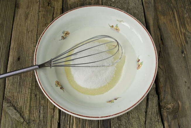En klop de dooiers meteen met een mixer tot ze wit worden. Voeg, zonder het werk van de mixer te stoppen, geleidelijk kristalsuiker toe en blijf op lage snelheid kloppen totdat de massa in volume toeneemt.