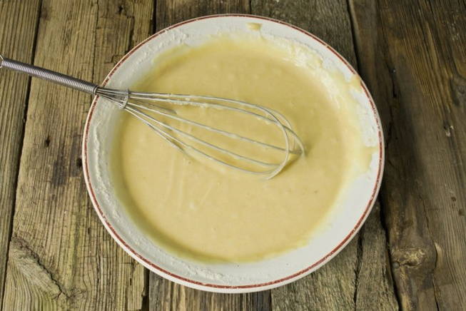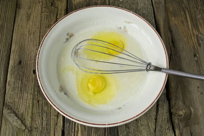 - Drijf kippeneieren in dezelfde kom en blijf alles kloppen tot een gladde massa.