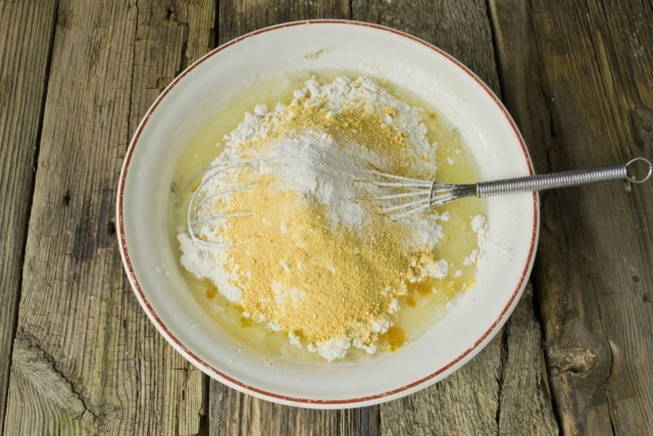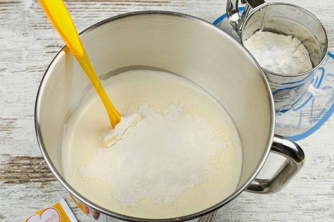 - Nadat de vloeibare basis is voorbereid, gaat u verder met het kneden van het deeg. Giet bloem gezeefd met bakpoeder in porties en meng de volledige inhoud met een spatel, in een poging de pracht van het deeg te behouden.