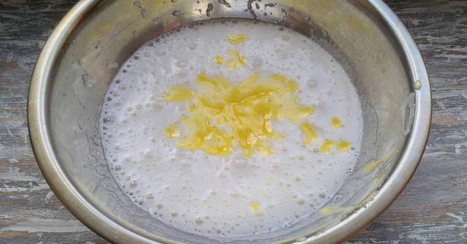 - Giet voor het deeg suiker, zout in kefir op kamertemperatuur en meng goed met een garde.