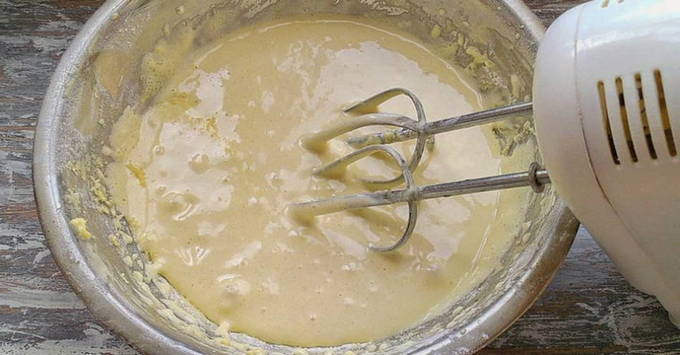 - Giet gewone en vanillesuiker bij de gebroken eieren en klop met een mixer op lage snelheid tot de massa in volume toeneemt.