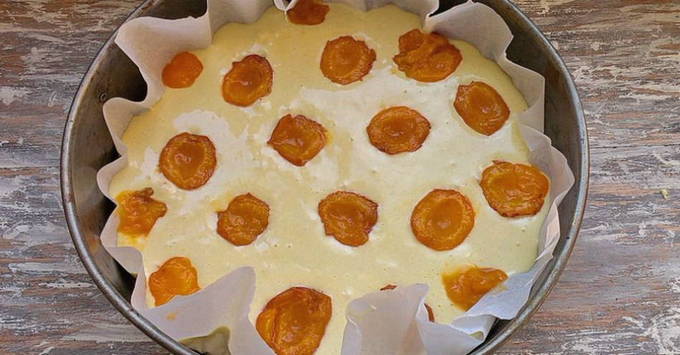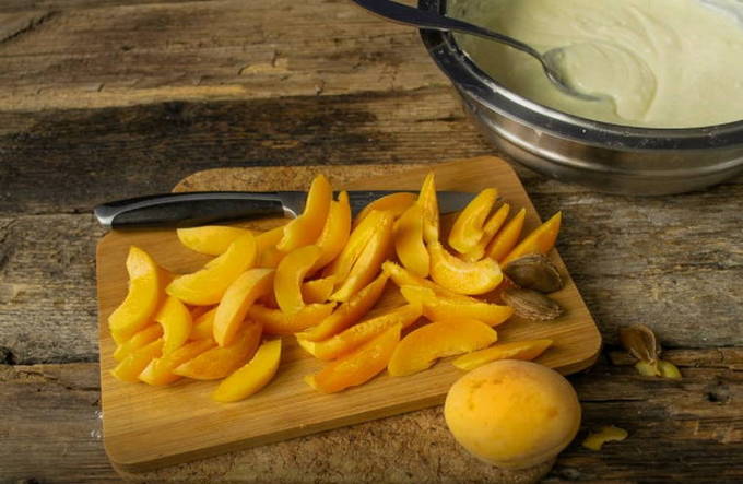 - We wassen de abrikozen goed, snijden ze in twee helften en nadat we alle zaden hebben verwijderd, leggen we ze op de bodem van de vorm.