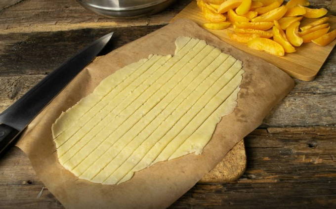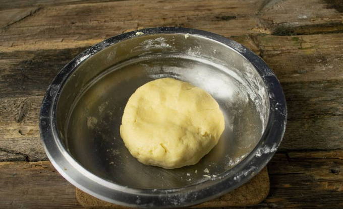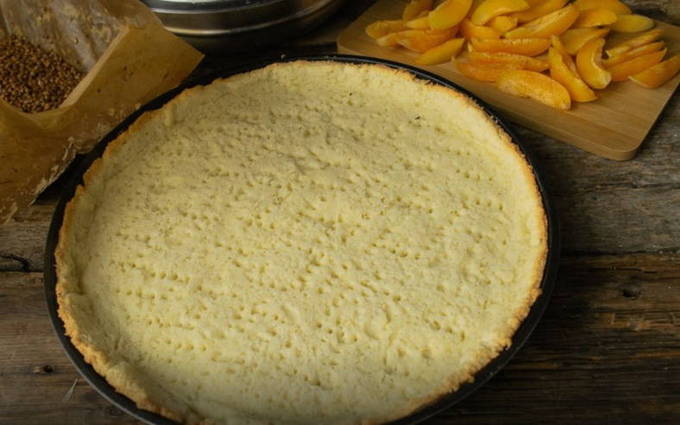 - We scheiden het vierde deel van het gekoelde deeg en rollen het grote deel uit in de vorm van een dunne laag en doen het in een vorm, waarbij we het stevig op de bodem en de randen drukken. Vervolgens maken we met een vork gaatjes zodat de stoom kan ontsnappen.