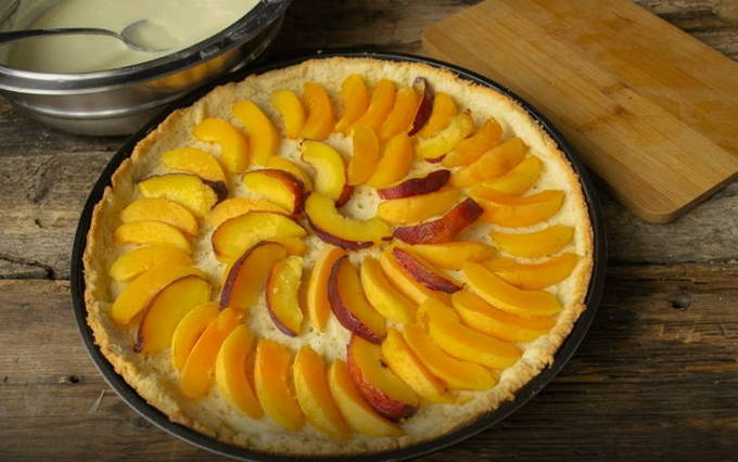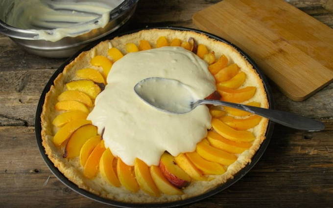 - Als de bodem een beetje is afgekoeld, vul je deze met abrikozen.