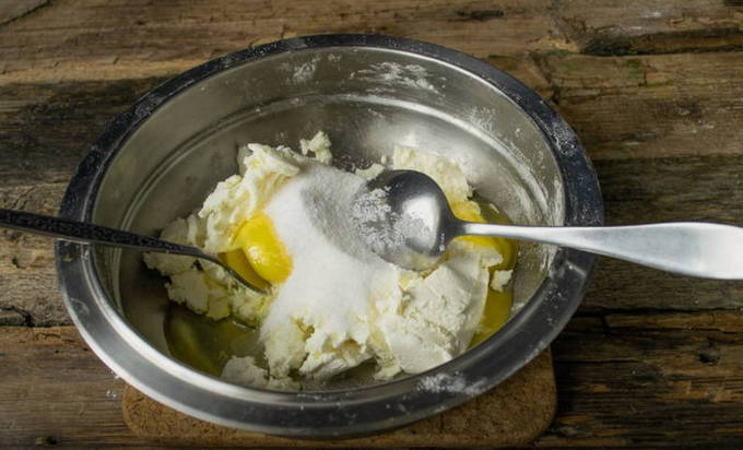 - Voeg eieren, 100 gram suiker en een paar druppels vanille-extract toe aan de geraspte kwark. Meng alles goed.