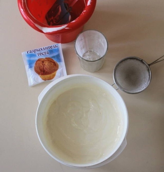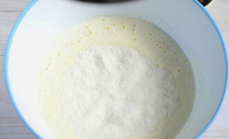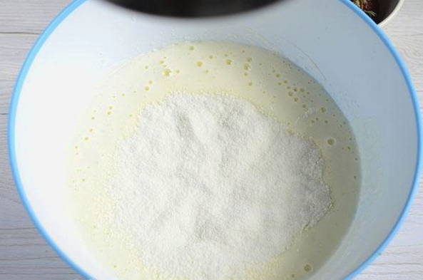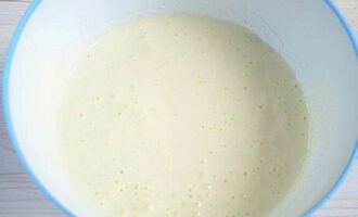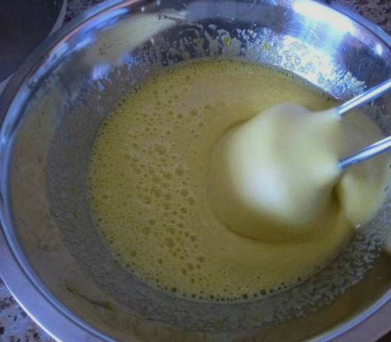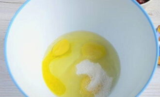 - Klop eieren met zout en suiker met een mixer gedurende 6-7 minuten tot een luchtige massa is gevormd.