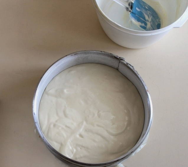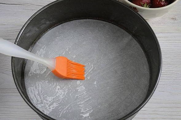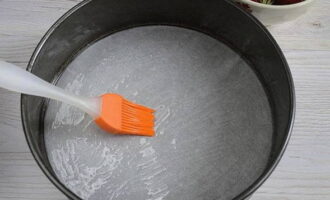 - Bedek de vorm met bakpapier, vet de randen van de vorm in met olie. Het deeg opdoen.