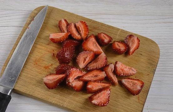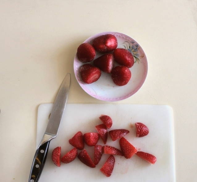 We wassen de aardbeien, drogen en snijden elke bes in vier delen.